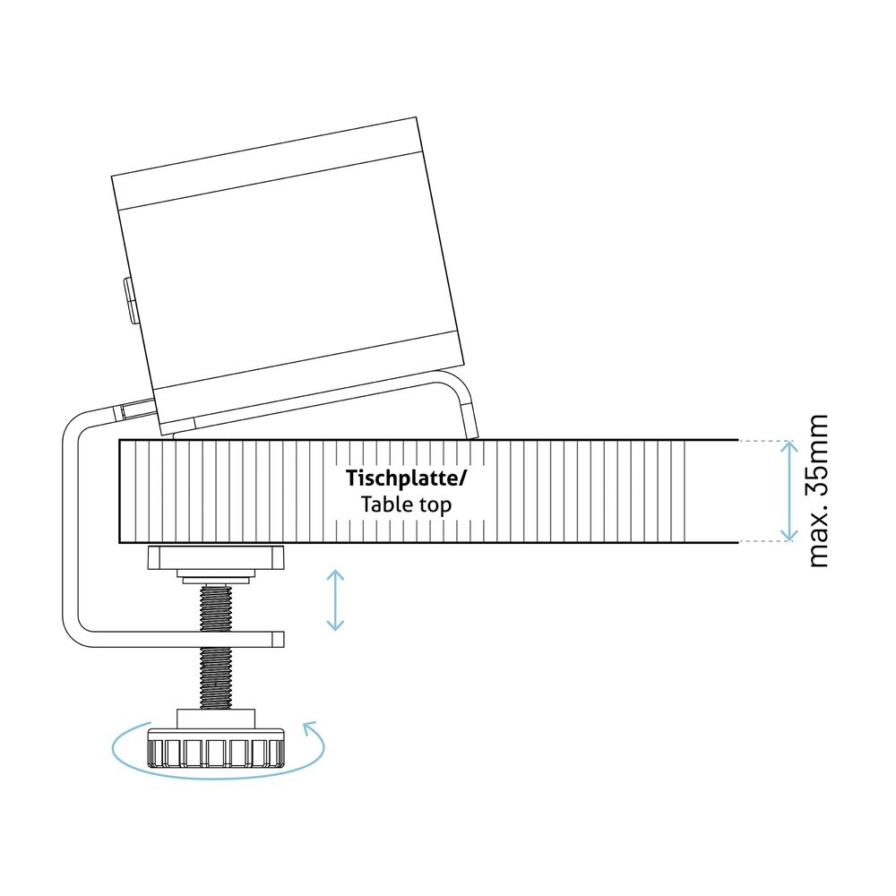 Convenient and Reliable Mounting Solution: Upgrade your workspace with the on-table Desk Clamp for mediahub2, providing a reliable and convenient mounting option for any flat surface that is less than 35mm thick.