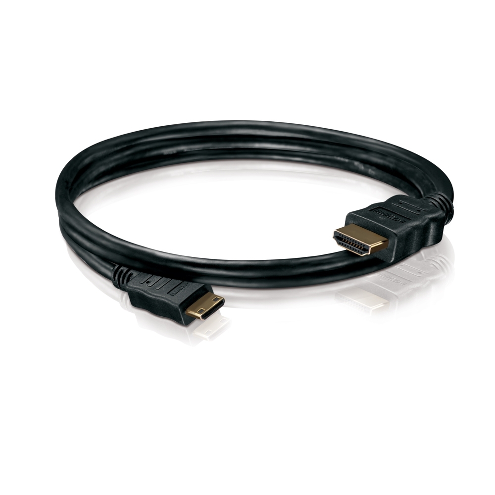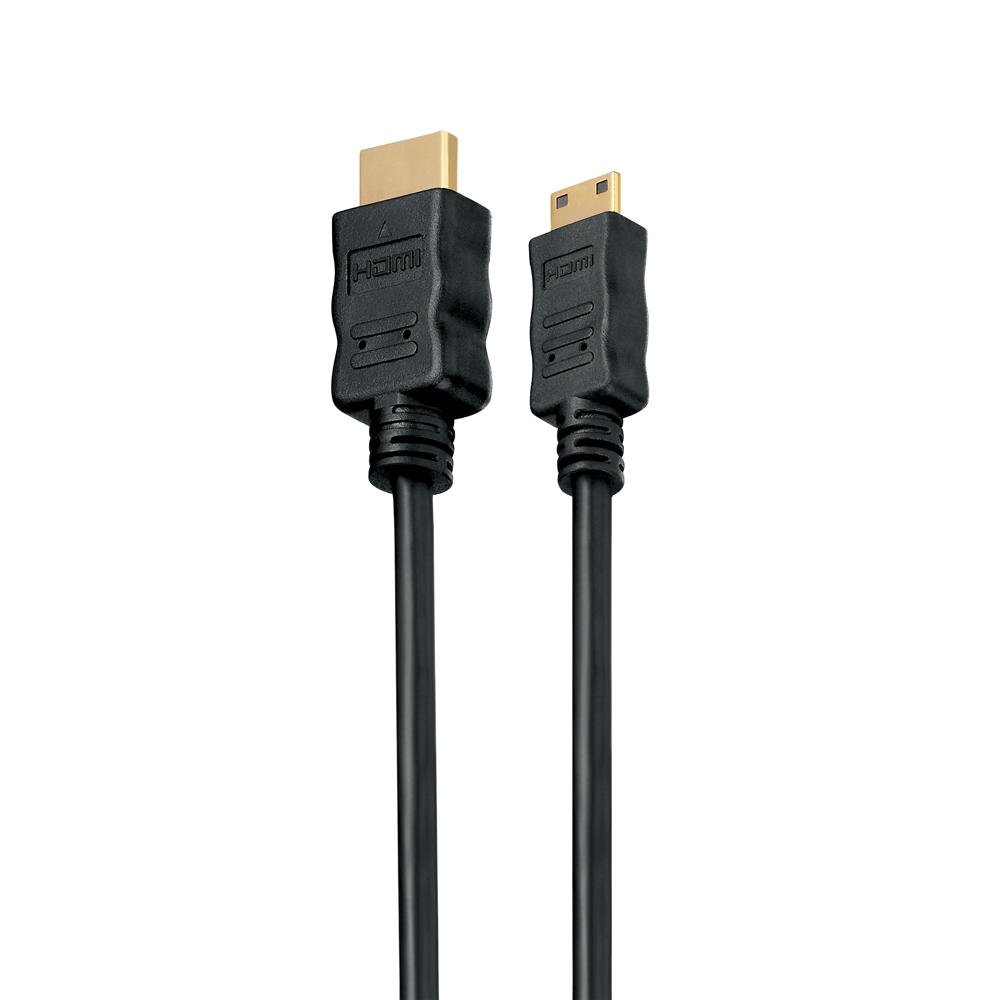 High Speed Mini HDMI Cable with Ethernet Channel (HEAC) and gold plated contacts. HDMI A Male (19pin) to Mini HDMI C Male (19pin). Double shielded. Length: 0,50m